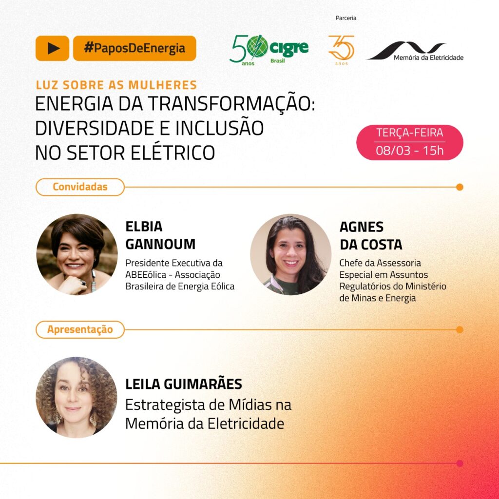 O Webinar Luz sobre as Mulheres é o foco da sinergia em questão, da série #paposdeenergia, entre CIGRE-Brasil e Memória da Eletricidade. A ideia concebida teve como propósito conceder uma homenagem às mulheres, aproveitando não só o ensejo do mês em que se comemora o dia 08 de março - Dia Internacional da Mulher – como também para reforçar o posicionamento do CIGRE e seu engajamento na causa de um mundo mais inclusivo, equitativo e, sobretudo, integrativo.