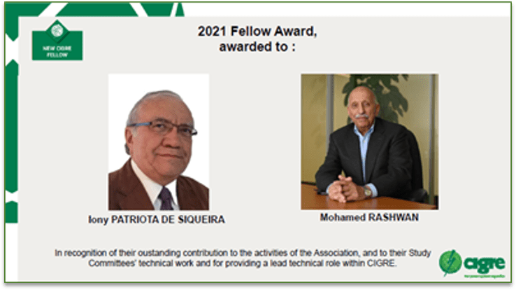Iony Patriota de Siqueira, diretor técnico do CIGRE-Brasil, professor convidado das Universidades Federal e Estadual de Pernambuco (UFPE e UPE). e presidente da Tecnix, recebe o prêmio 2021 Fellow Award em reconhecimento pela sua notável contribuição às atividades do CIGRE e ao seu papel de líder técnico no âmbito internacional e nacional.