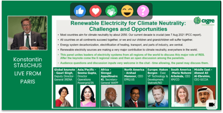 Em seguida Konstantin Staschus, ex-presidente da Plataforma Europeia de Tecnologia e Inovação “Redes Inteligentes para Transição de Energia” e hoje diretor da StaRGET GmbH, conduziu o painel sobre desafios e oportunidades das energias renováveis em prol do impacto neutro no clima. Como palestrante principal o CIGRE trouxe Gauri Singh, diretora geral da Agência Internacional para Energias Renováveis (IRENA) e os representantes de destaque das regiões Asia e Pacífico, África do Sul, América do Norte, Europa, América do Sul e Oriente Médio.