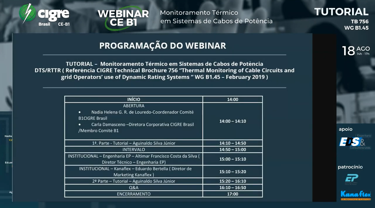 O webinar ainda contou com a presença da Diretora de Assuntos Corporativos do CIGRE-Brasil, Carla Damasceno Peixoto, que deu às boas-vindas aos presentes, além do Secretário do CE, Eduardo Karabolad e dos patrocinadores Empreiteira Paulistana e Kanaflex.