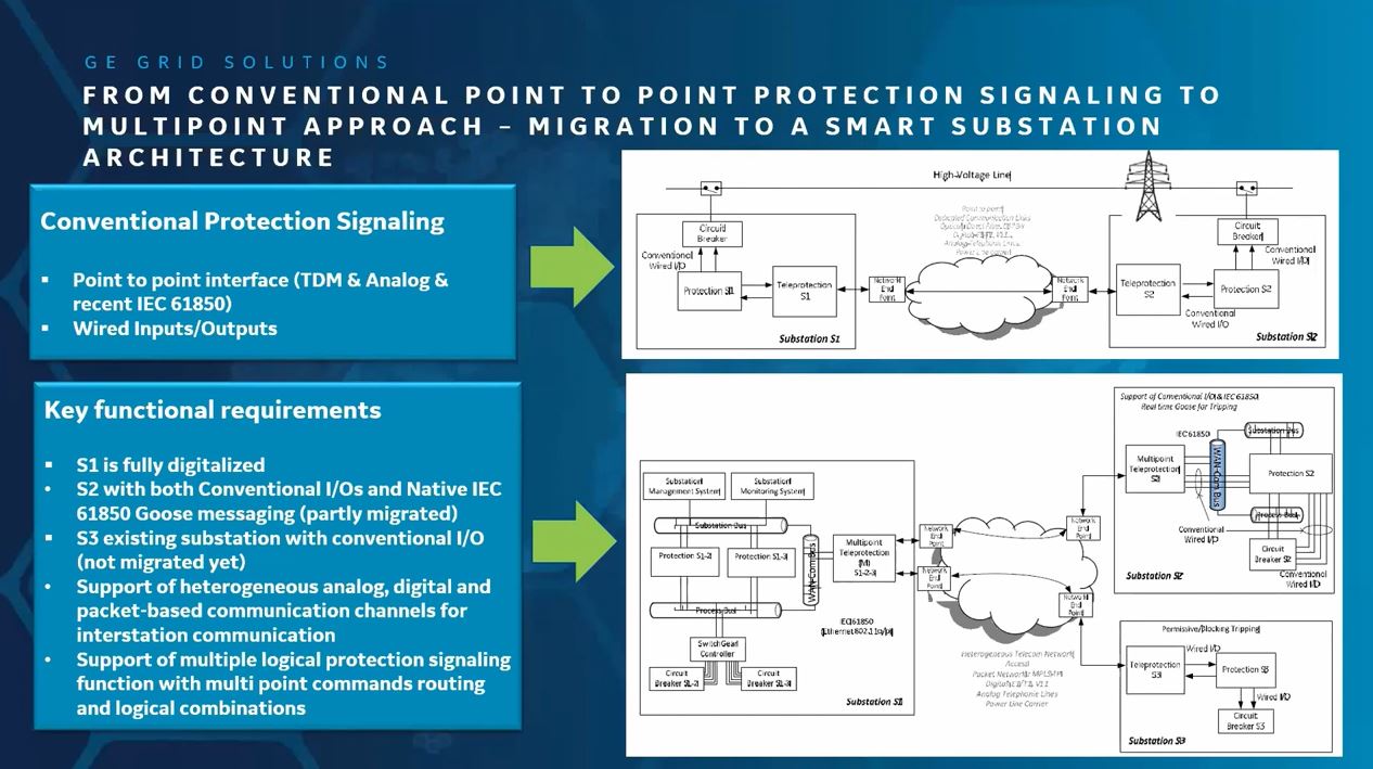 Como parte dessa transformação, as aplicações de proteção e controle estão migrando para Ethernet comutada por pacotes transportados por fibras, contêineres virtuais SDH ou por MPLS-TP. Outras aplicações de subestação, como SCADA e voz, já evoluíram ou seguem desenvolvimento semelhante, levando gradualmente à convergência Ethernet das interfaces usuário-rede. Uma nova geração de dispositivos de sinalização, o DIP.net da GE permite que a concessionária construa redes de comunicação de status e comando de comutação de pacotes independentemente da infraestrutura IP/Ethernet da subestação. Essa estratégia de rede fornece comportamento determinístico, confiabilidade, resiliência e segurança de serviço de nível de proteção, bem como “transporte em qualquer meio” combinando IEC 61850 e sinalização convencional na mesma rede. Finalmente, uma nova geração de Power Line Carriers pode trazer o complemento necessário para cobrir as “últimas milhas” sem fibra para esta arquitetura.