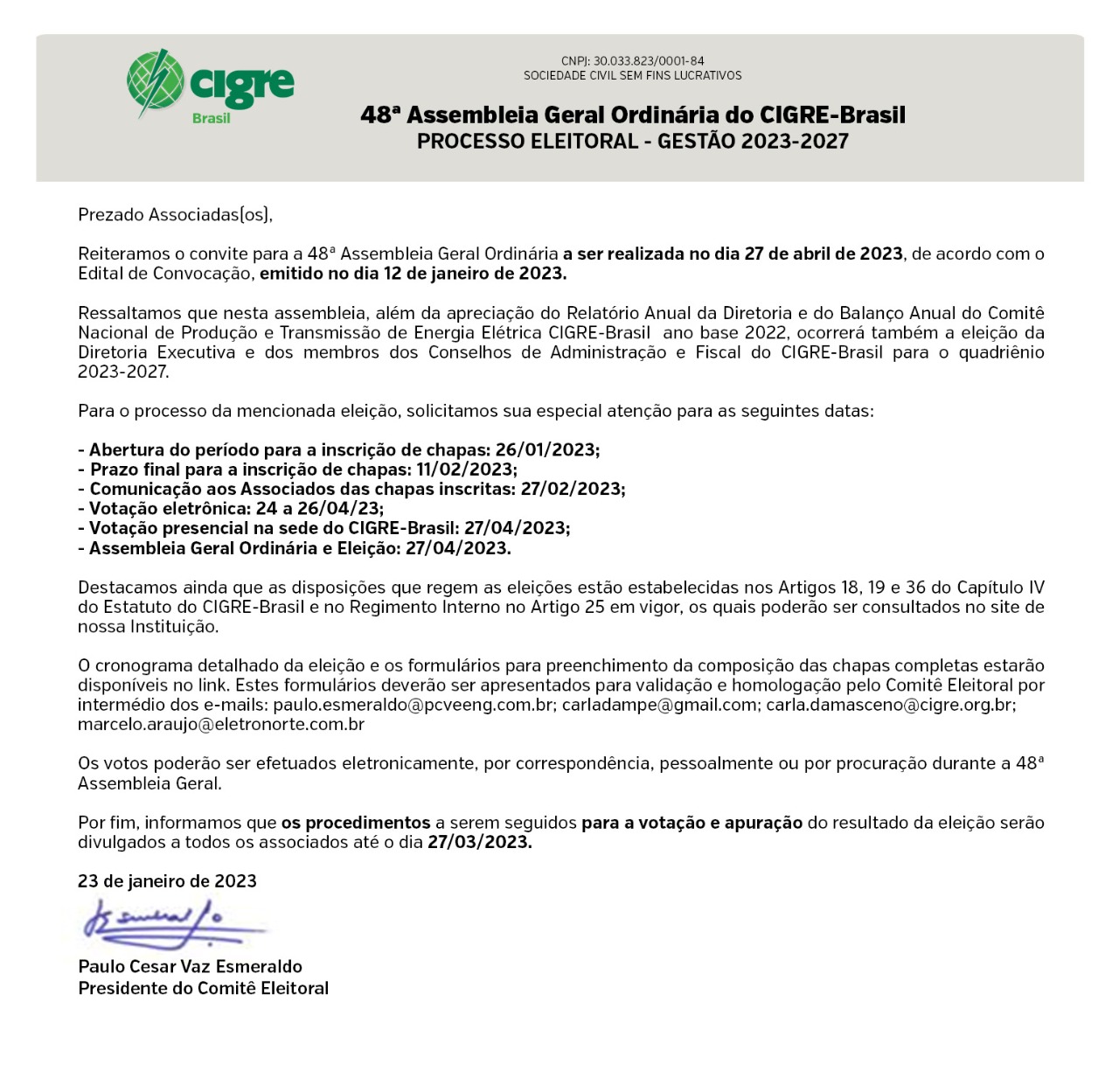 - Votação presencial na sede do CIGRE-Brasil: 27/04/2023;