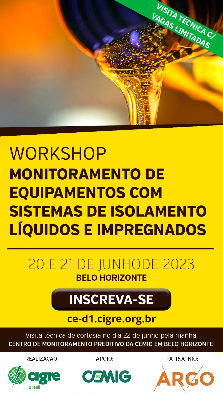 Workshop - Monitoramento de Equipamentos com Sistemas de Isolamento Líquidos e Impregnados - uma iniciativa do Comitê de Estudo D1 – Materiais e Tecnologias Emergentes de Ensaios do CIGRE Brasil, nos dias 20 e 21 de junho, na capital mineira, Belo Horizonte - MG.
