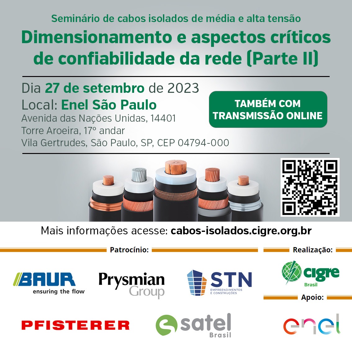 Em sua 2a parte, no dia 27.09.23, o evento trará aos participantes, mais uma vez, uma visão atualizada da fronteira do conhecimento no que se refere aos aspectos de projeto e operação de cabos elétricos isolados isolados de média e alta tensão, apresentado por especialistas renomados e de referência no setor.