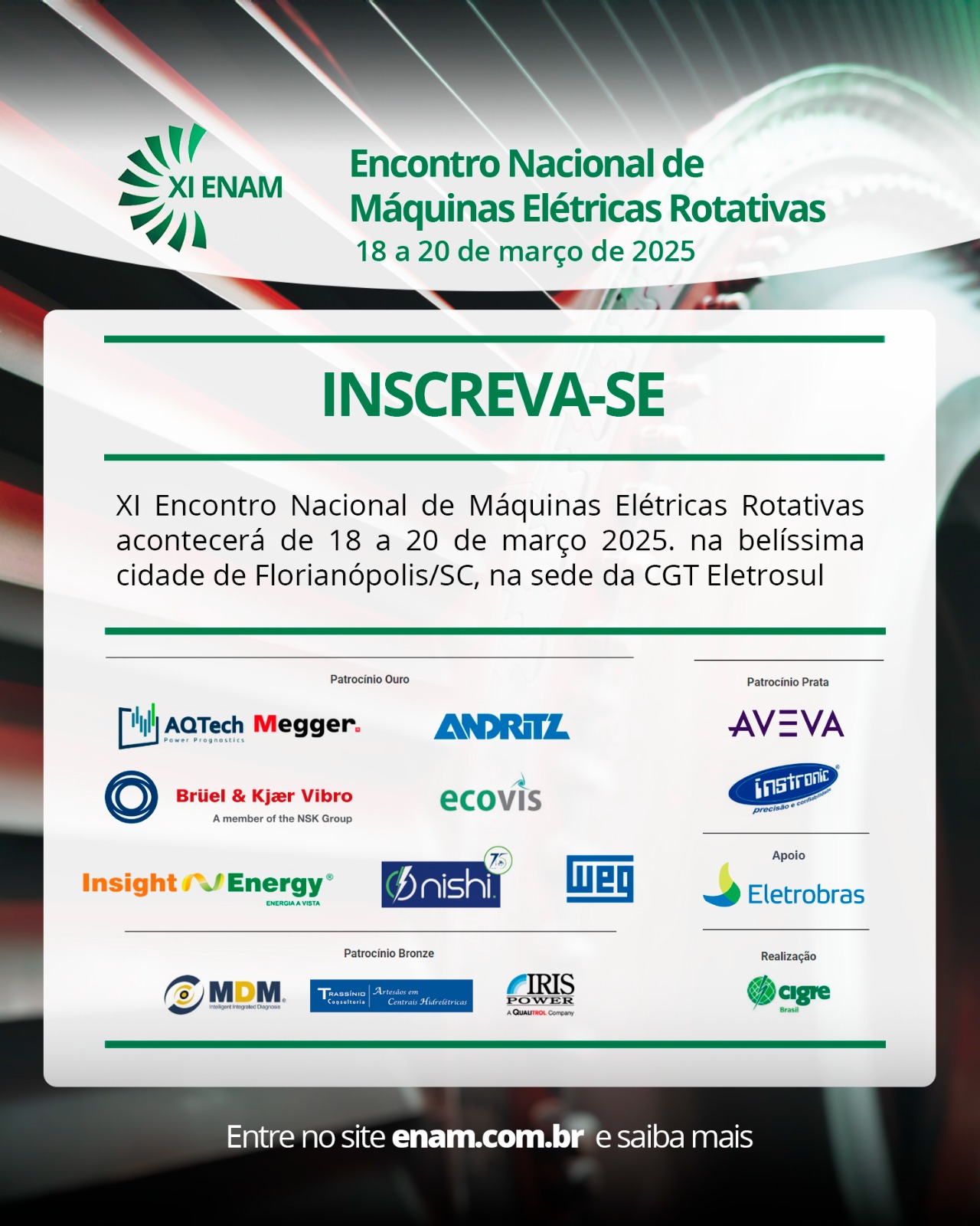 A 11ª edição do ENAM - Encontro Nacional de Máquinas Rotativas - já tem data marcada: de 18 a 20 de março de 2025, no auditório da CGT Eletrosul - Florianópolis - SC, com o apoio da Eletrobras.
