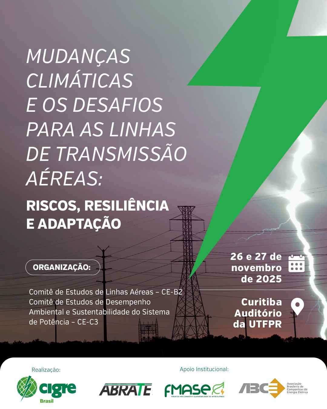 O CIGRE-Brasil convida para o Workshop Mudanças Climáticas e os Desafios para as Linhas de Transmissão Aéreas: Riscos, Resiliência e Adaptação, promovido por meio dos Comitês de Linhas Aéreas (CE - B2) e de Desempenho Ambiental e Sustentabilidade do Sistema de Potência (CE - C3).