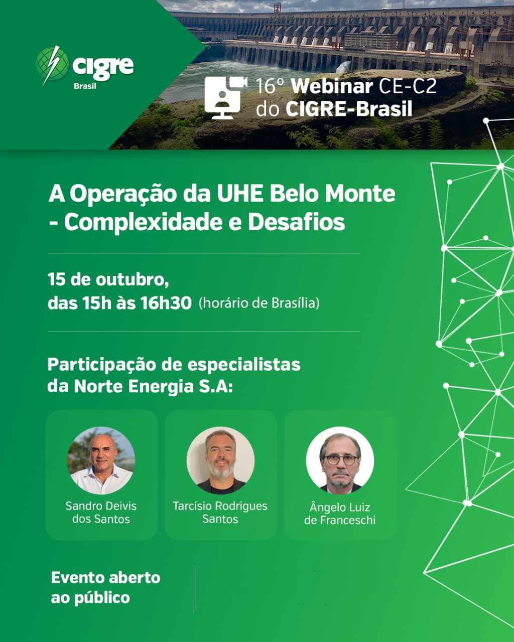 Os palestrantes da Norte Energia são Sandro Deivis dos Santos, superintendente de operações, Tarcísio Rodrigues Santos, gerente de operações, e Ângelo Luiz de Franceschi, gerente de planejamento da operação de Belo Monte.