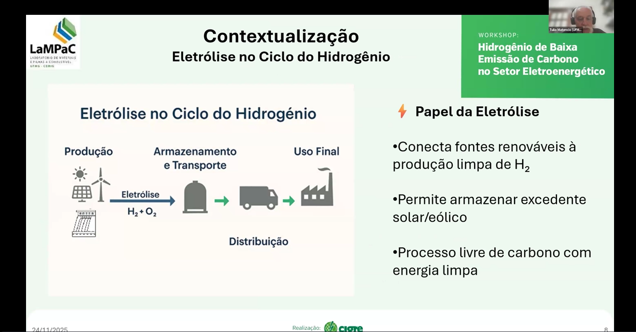 A primeira foi o webinar Hidrogênio de Baixa Emissão de Carbono no Setor Eletroenergético – promovido pelo Comitê de Estudos D1 - Materiais e Tecnologias Emergentes -, nos dias 24 e 25.11.25 - dedicado a engenheiros, químicos e demais profissionais técnicos de empresas, universidades e centros de pesquisa.