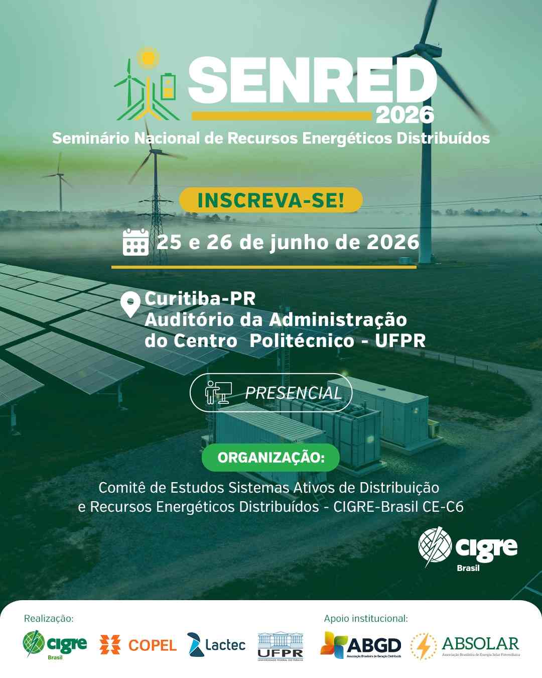 O CIGRE‑Brasil realiza o SENRED – Seminário Nacional de Recursos Energéticos Distribuídos, nos dias 25 e 26 de junho de 2026, em Curitiba (PR), com a parceria da Copel e do Lactec.